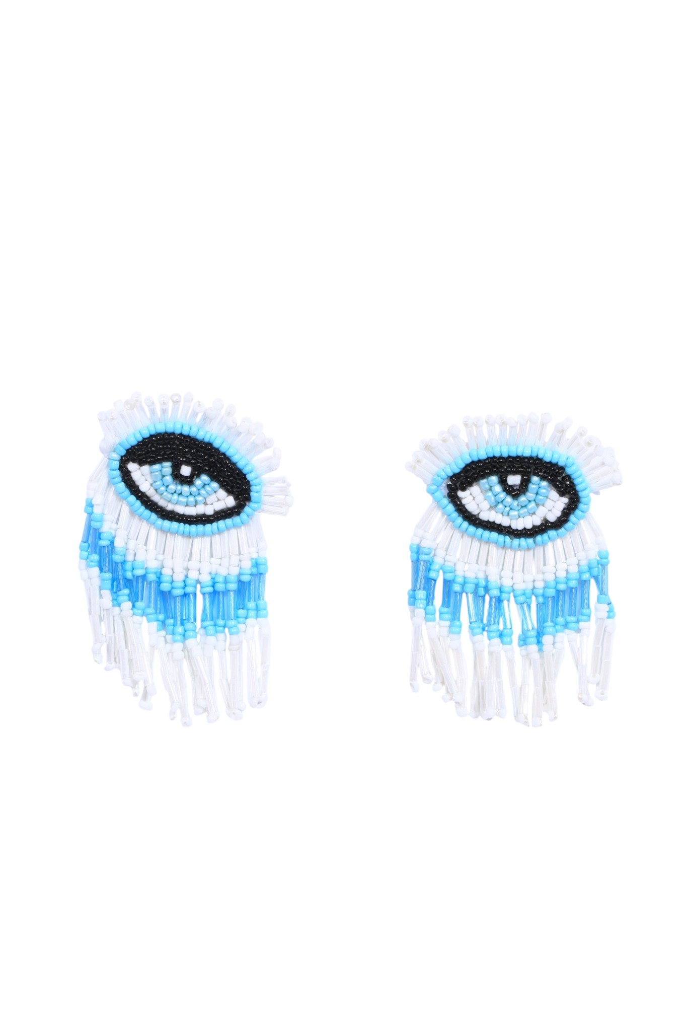 Γυναικεία σκουλαρίκια μάτι, χειροποίητα με χάντρες σε μπλε/λευκές αποχρώσεις και κρόσσια. Ιδανικά για boho εμφανίσεις και καλοκαιρινά looks. Ελαφριά, εντυπωσιακά σκουλαρίκια για καθημερινή ή βραδινή χρήση.
