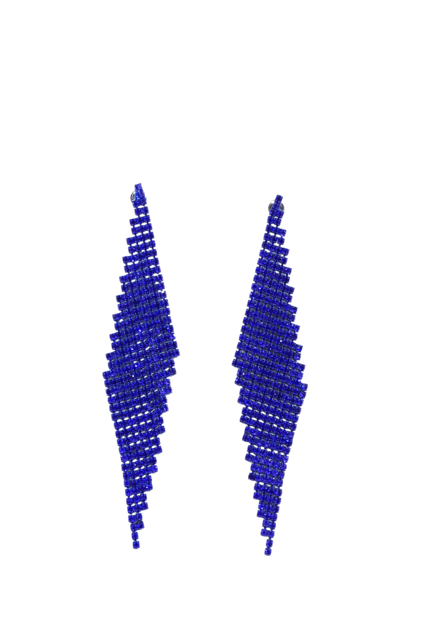 Μακριά σκουλαρίκια με στρας σε έντονο μπλε, σε εντυπωσιακή taper γραμμή. Τραβούν το φως και επιμηκύνουν οπτικά τον λαιμό.