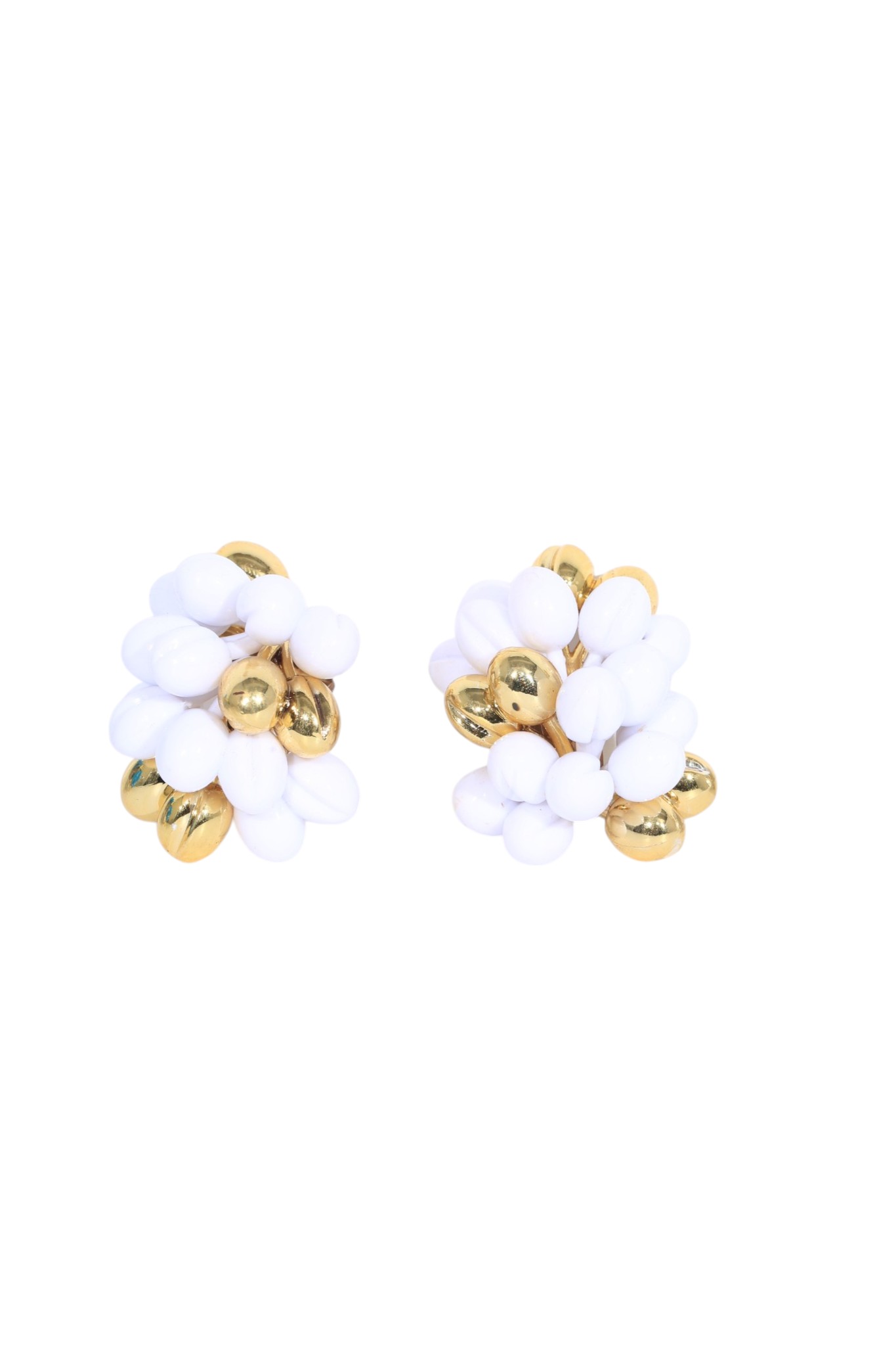 Σκουλαρίκια cluster σε λευκό με χρυσές λεπτομέρειες. Έχουν καθαρό, φωτεινό αποτέλεσμα και ταιριάζουν υπέροχα με minimal ή elegant σύνολα.