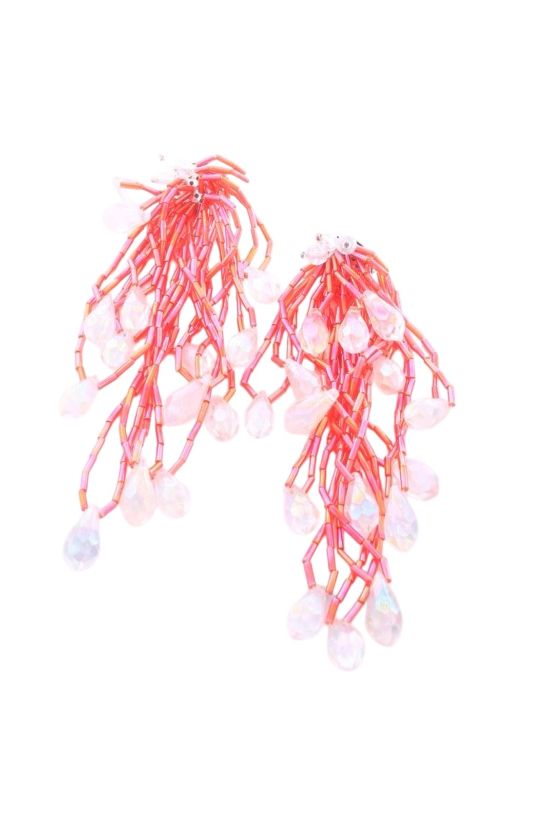 Ένα εντυπωσιακό ζευγάρι με χάντρες σε κοραλί ροζ αποχρώσεις που φωτίζει αμέσως το look σας. Οι κρεμαστές λεπτομέρειες με ιριδίζοντα στοιχεία χαρίζουν κίνηση και ταιριάζουν όμορφα σε party και καλοκαιρινές εμφανίσεις.
