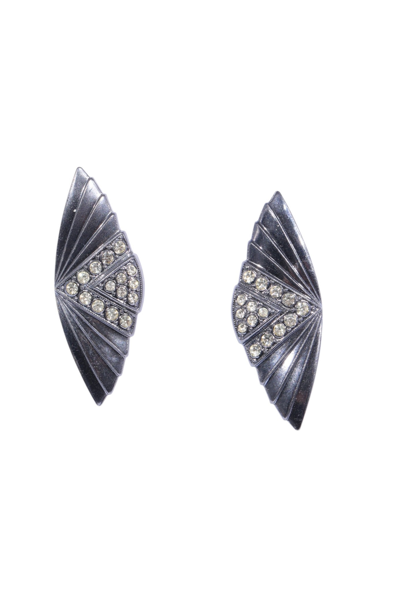 Gunmetal σκουλαρίκια με ανάγλυφη Art Deco φόρμα και στρας. Σοφιστικέ, με δυναμική λάμψη που δεν κουράζει.